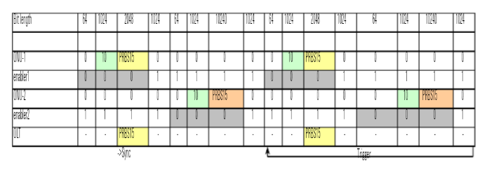 如下面的圖表所示,表中的每一列的BitLength代表每個Block的長度。每行代表發(fā)送信號給ONU和enable或OLT的Generator模塊發(fā)送的不同Block的信號,依圖表所示依次編輯號(Block的長度可以根據(jù)具體器件的要求改變)。