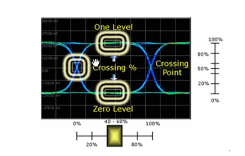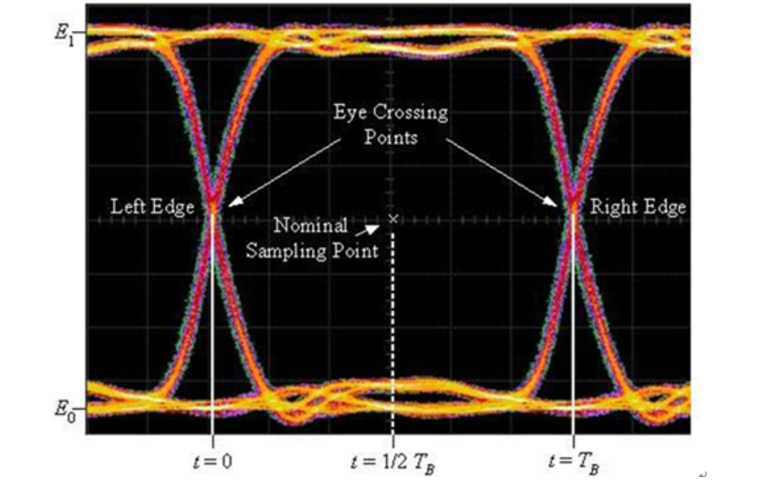 眼寬”反映信號的總抖動,即是眼圖在水平軸所開的大小,其定義為兩上緣與下緣交匯的點(diǎn)(Crossing Point)間的時間差。