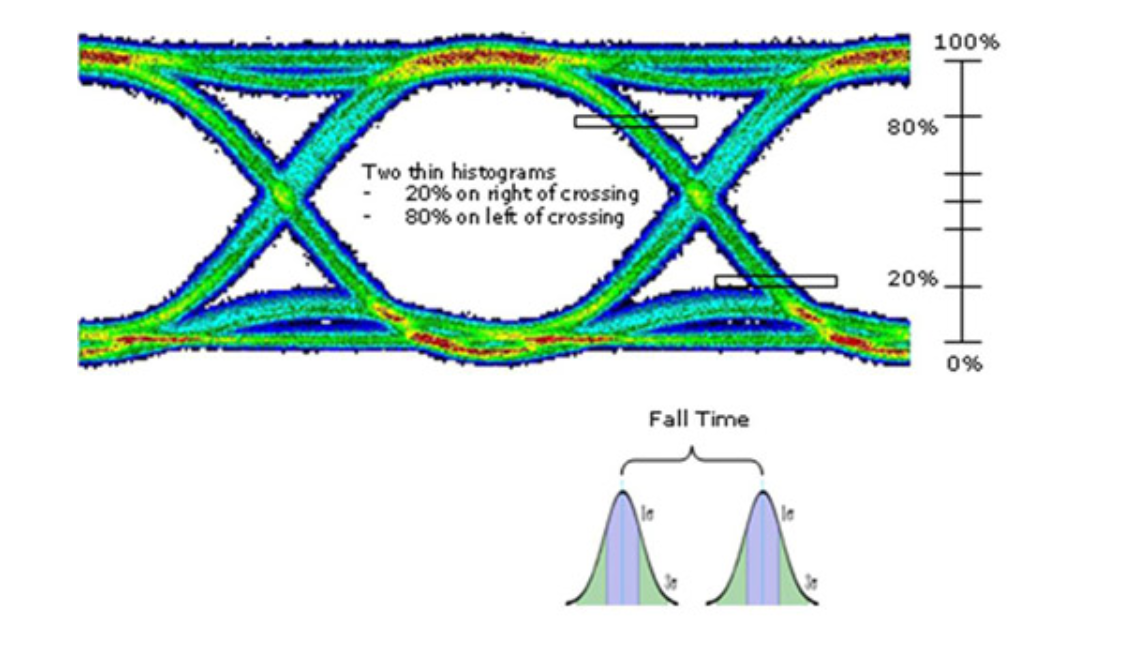 眼幅度”表示“1”電平信號分布與“0”電平信號分布平均數(shù)之差,其測量是通過在眼圖中央位置附近區(qū)域(通常為零點(diǎn)交叉時間之間距離的20%)分布振幅值進(jìn)行的。
