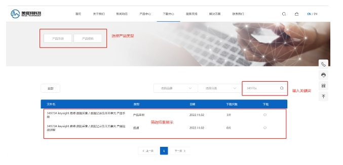 步驟二:點擊導航欄上“產(chǎn)品中心”,進入產(chǎn)品中心頁面,輸入需要查詢的產(chǎn)品型號,例:34970A。點擊搜索即可
