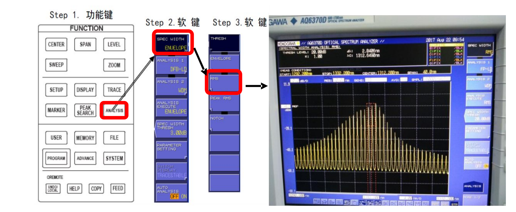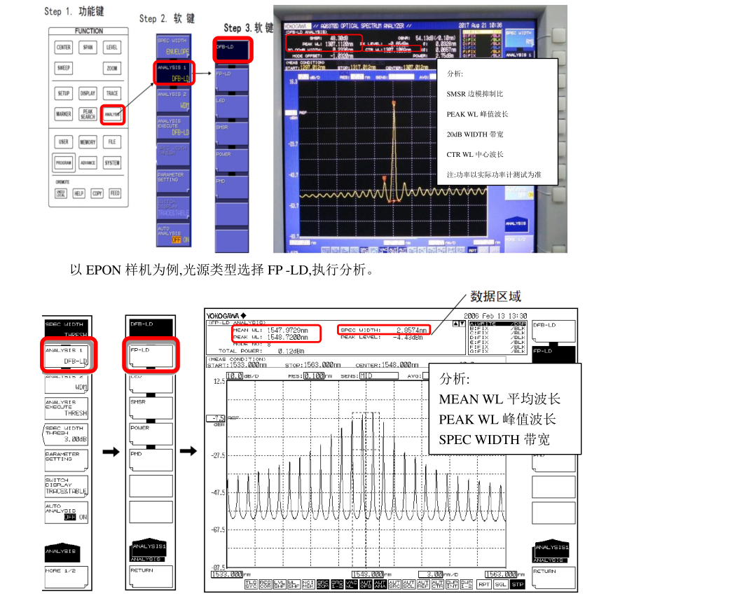 注意:在分析 FP-LD 光源時(shí),數(shù)據(jù)區(qū)域內(nèi) SPEC WIDTH 測(cè)試得就是 3dB 帶寬,與 K 系數(shù)有關(guān),當(dāng) K=1 時(shí),SPEC