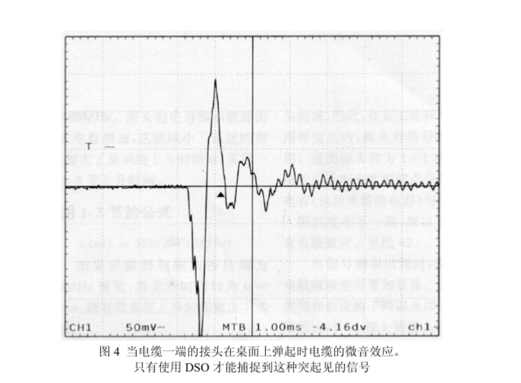 如果某一個事件只發(fā)生一次, 那么模擬示波器通常是不能應(yīng)付的。 而這正是DSO 展示其強大能力的時機, DSO 能夠捕捉這種罕見的一次性事件, 并且按照你的的希望長時間地將它顯示出來。這種罕見的事件甚至可能是干擾的結(jié)果, 通過用干擾本身來觸發(fā), DSO 具有顯示預(yù)觸發(fā)信息的能力, 包括顯示干擾的原因。圖 4 顯示的是當(dāng)電纜一端的開路接在桌面上彈起時電纜的微音效應(yīng)波形, 圖中觸發(fā)時刻用 Δ 符號來表示, 這個符號左邊的波形信息就是預(yù)觸發(fā)信息。