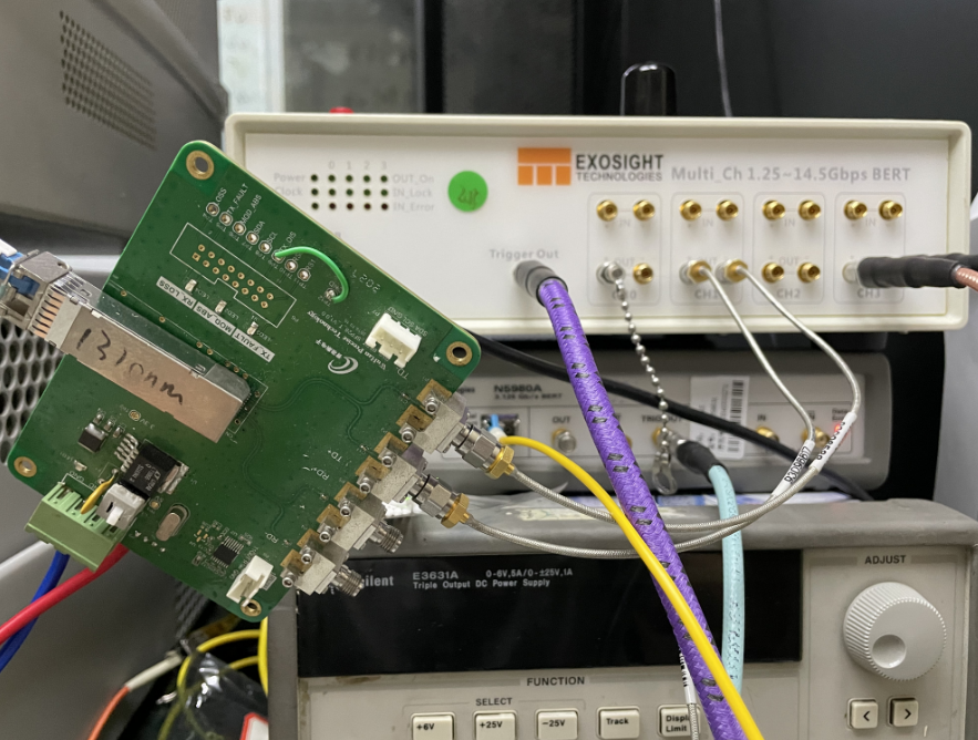 (1)根據(jù)檢測(cè)板將誤碼儀給予的電子信號(hào)轉(zhuǎn)成光信號(hào)燈不亮傳遞到25G光模塊,根據(jù)光纖尾纖連接光數(shù)字示波器中;