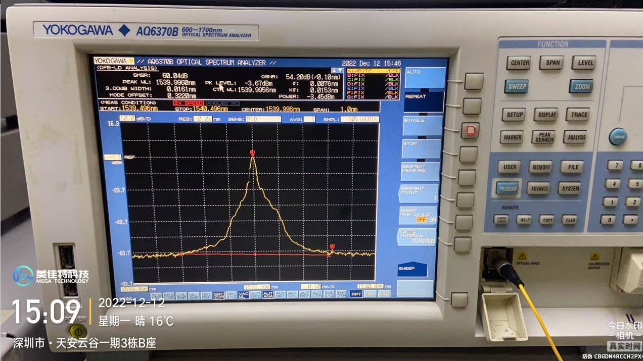(4)按住頻譜儀上的“Auto”鍵;全自動(dòng)載入關(guān)鍵主要參數(shù)(包括發(fā)送激光功率),等候頻譜儀的圖片表明地區(qū)表明徹底后,再開(kāi)展控制模塊核心光波長(zhǎng)值及邊模抑止比(SMSR)載入。下面的圖為40GER4光模塊的光譜分析儀測(cè)試圖,圖上光模塊的發(fā)送激光功率為2.8dBm;