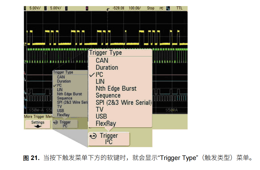 軟鍵常出現(xiàn)在未安裝 Windows 操作系統(tǒng)的示波器上(軟鍵圖片見圖 8)。 使用這些軟鍵可以導(dǎo)航示波器顯 示屏上的菜單系統(tǒng)。 21 顯示了按下軟鍵時下拉菜單的樣子。 圖中顯示的是用于選擇觸發(fā)模式的菜單。 您可以連續(xù)按軟鍵進(jìn)行滾動選擇,前面板上的有一個旋鈕,也用于滾動選擇。 21. 當(dāng)按下觸發(fā)菜單下方的軟鍵時,就會顯示“Trigger Type”(觸發(fā)類型)菜單。