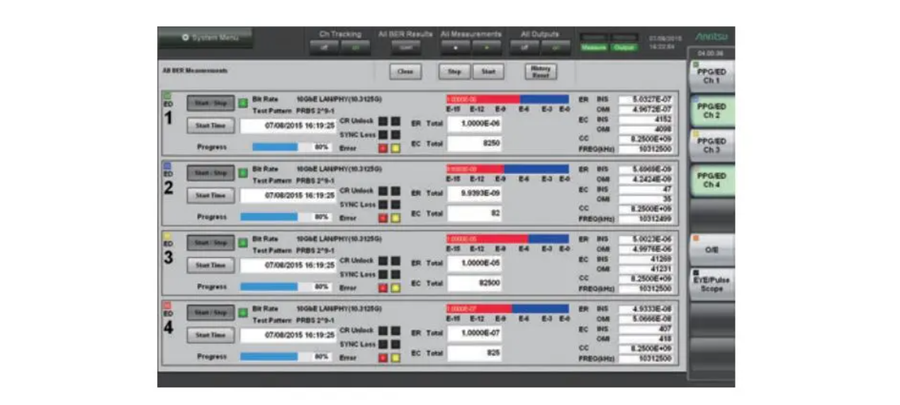 MP2100 B使用BERT通道排名功能來(lái)支持高達(dá)4通道的批量設(shè)置和測(cè)量,還內(nèi)置了可批量捕獲測(cè)量結(jié)果的標(biāo)準(zhǔn)功能,極大地縮短了40 GbE(10 Gbit/s×4)QSFP+ BER的測(cè)量時(shí)間。此外,它能夠在約10ms的時(shí)間里捕獲BER測(cè)量結(jié)果,這也減少了測(cè)量時(shí)間。