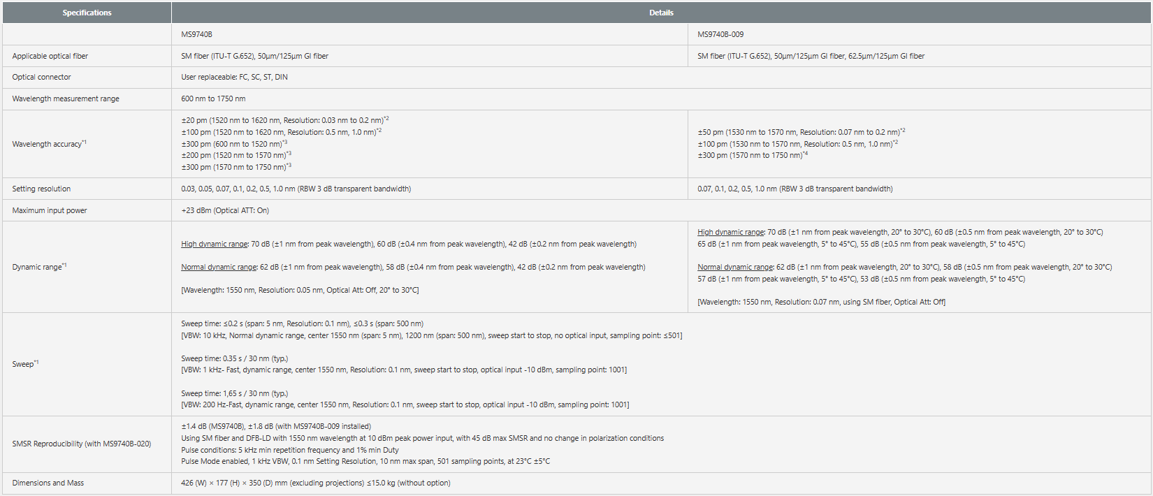 MS9740B是Anritsu公司生產的一款光譜分析儀,主要用于測量和分析光源的光譜特性。該設備的主要參數包括: