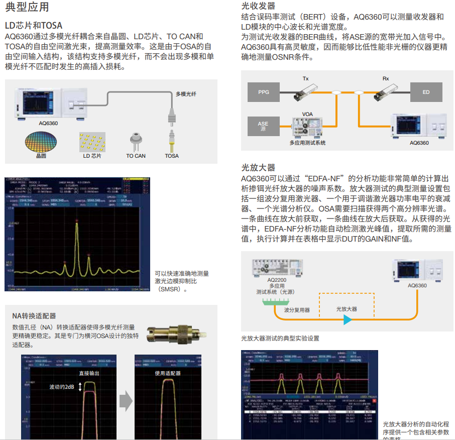 此外,AQ6360還被廣泛應(yīng)用于光纖通信、光纖傳感器、光學(xué)器件研究等領(lǐng)域。這些應(yīng)用領(lǐng)域的多樣性進(jìn)一步證明了AQ6360的多功能性和高效率,能夠滿足不同行業(yè)對(duì)于光譜分析的需求。特別是在光纖通信領(lǐng)域,AQ6360通過(guò)測(cè)量和分析光學(xué)元器件和光學(xué)系統(tǒng)的性能,為光纖通信技術(shù)的發(fā)展提供了強(qiáng)有力的支持。
