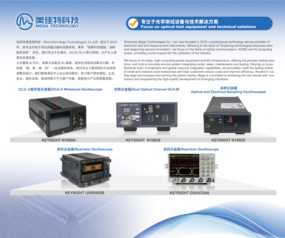 成立于 2010 年,美佳特科技始終專(zhuān)注于光通信、5G/6G 及 AI 算力領(lǐng)域,是國(guó)內(nèi)領(lǐng)先的電子測(cè)試測(cè)量?jī)x器技術(shù)服務(wù)商。我們以 “技術(shù)賦能、服務(wù)深耕” 為理念,圍繞光芯片、光模塊等核心環(huán)節(jié),為客戶(hù)提供覆蓋 “租、售、修、測(cè)” 的一站式服務(wù)體系。憑借專(zhuān)業(yè)的技術(shù)團(tuán)隊(duì)與快速響應(yīng)能力,我們已成為眾多中小微企業(yè)及科研機(jī)構(gòu)的可靠伙伴,助力新興產(chǎn)業(yè)高質(zhì)量發(fā)展。