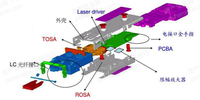 光發(fā)射組件TOSA(Transmitter Optical Subassembly):激光器、金屬結(jié)構(gòu)件和陶瓷插芯等;