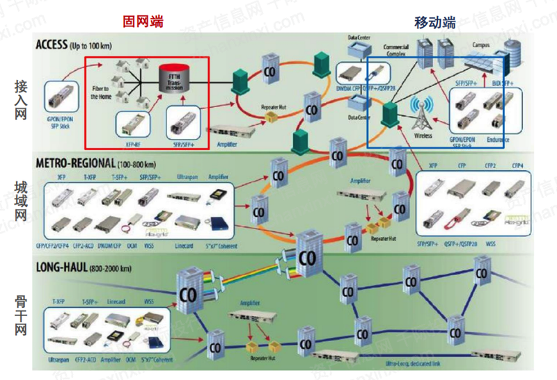 城域網(wǎng)(Metro-Regional):10G/40G→100G,目前主要使用SFP+、QSFP+,部分使用CFP等相關(guān)模塊;