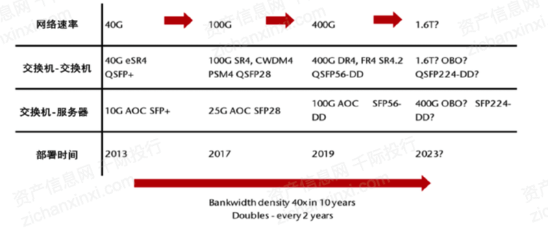 全球光器件龍頭OCLARO,2016年起,Amazon、Google等北美一線云服務(wù)提供商服務(wù)器端口開始由10G向25G升級(jí),葉、脊交換機(jī)端口由40G向100G升級(jí),預(yù)計(jì)2018年開始部署200/400G產(chǎn)品。