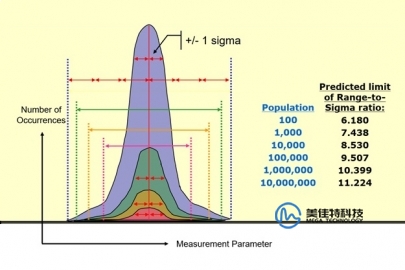 統(tǒng)計(jì)模型對現(xiàn)實(shí)世界系統(tǒng)行為的預(yù)測程度如何?在許多信號完整性應(yīng)用中,例如在給定誤碼率(BER)下估計(jì)隨機(jī)抖動,統(tǒng)計(jì)分布的給定總體用于推斷潛在的未來結(jié)果。同樣,圖 1 描述了一個模型,該模型預(yù)測高斯分布的各種總體大小的直方圖范圍與直方圖西格瑪(一個標(biāo)準(zhǔn)差)的比率。預(yù)測表明,隨著人口的增長,范圍與西格瑪之比的限制增加。