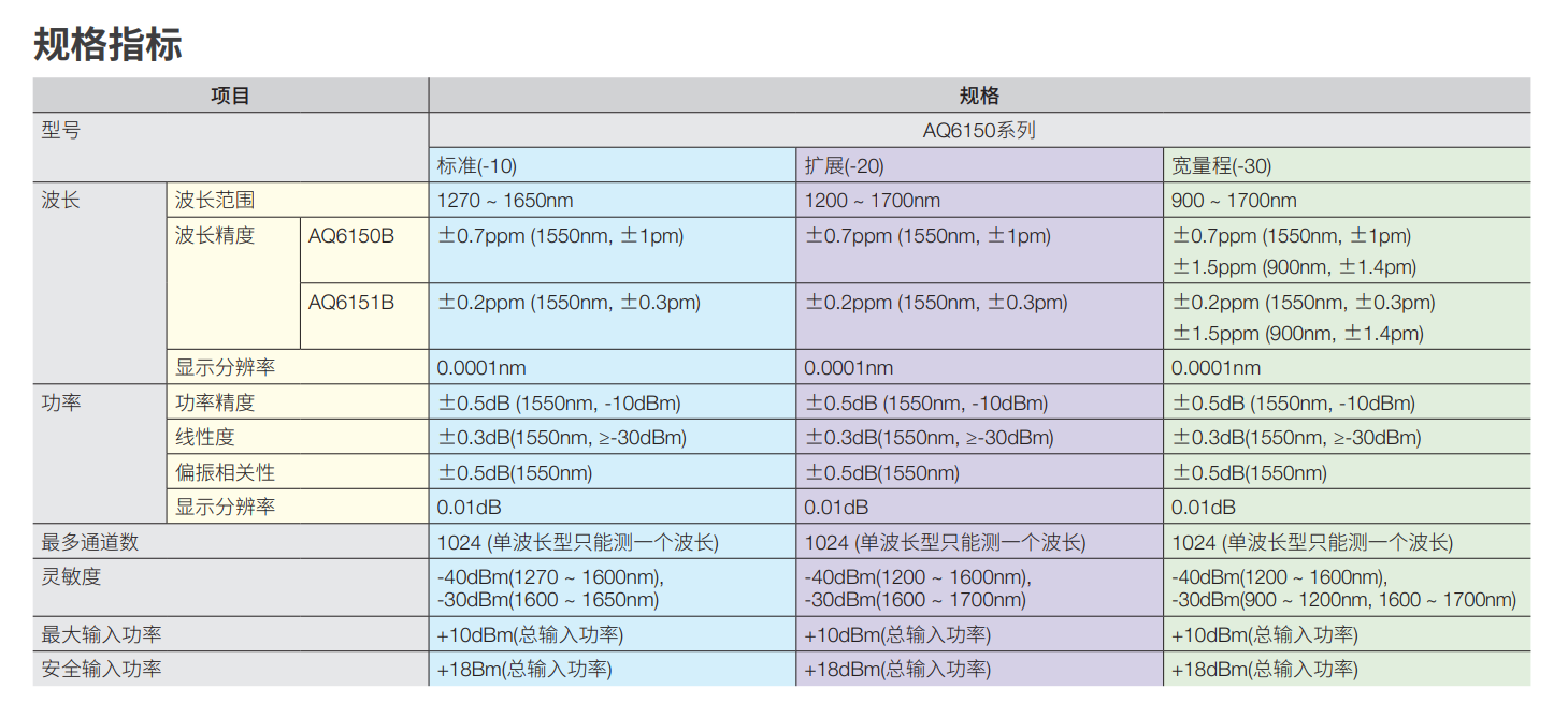 AQ6150系列一共有兩個機型。其中, AQ6151B是高精度型光波長計,波長精度高達(dá)±0.2ppm,可以滿足高級別的精度測量要求。 AQ6150B是標(biāo)準(zhǔn)型光波長計,波長精度可達(dá) ±0.7ppm,適用于對精度要求不高的測量應(yīng)用,價格更加實惠。